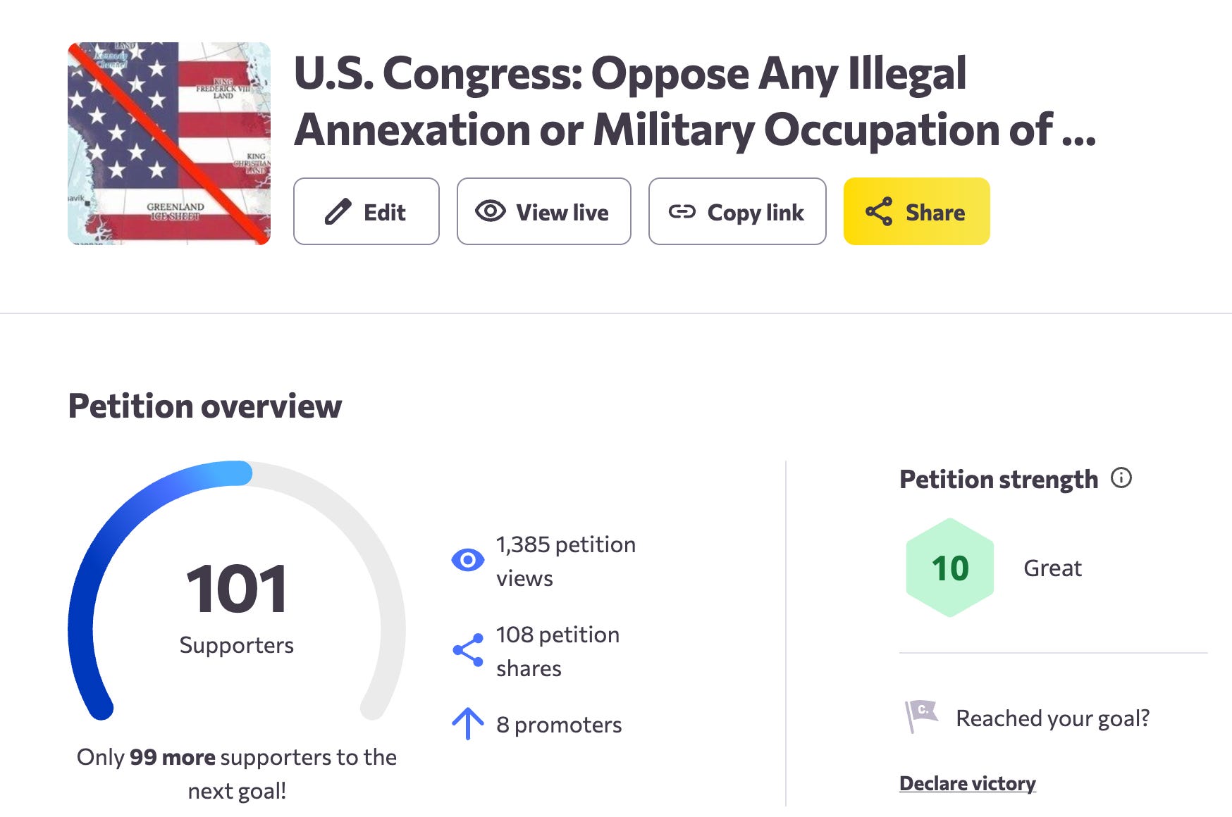 Hey all. Here’s a quick video update for you on the petition, which you can find here: Petition to the United States Congress: Oppose Any Illegal Annexation or Military Occupation of Greenland If you haven’t signed and oppose the U.S. bid to annex Greenland please do sign and forward.